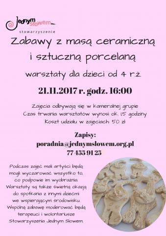 W naszej ofercie nowość! Z myślą o naszych małych odkrywcach świata uruchamiamy cykliczne warsztaty tematyczne dla dzieci. W tym miesiącu zapraszamy na wspólną zabawę masą ceramiczną i sztuczną porcelaną. Ktoś chętny? Piszcie lub dzwońcie.